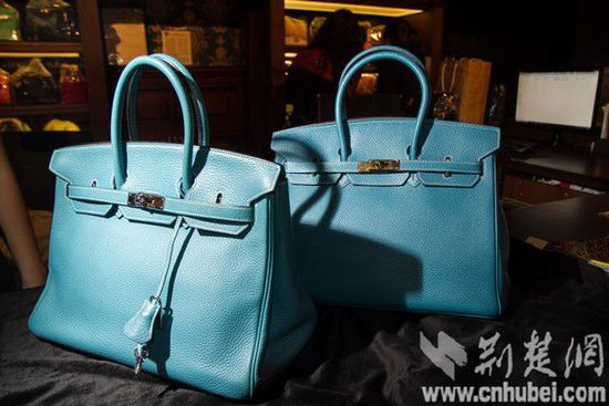 本物と偽物のエルメスのバッグを展示する店(左が正規(guī)品、右が鑑定士が鑑定した模倣品)正規(guī)品の市場価格は約10萬元(約189萬円)