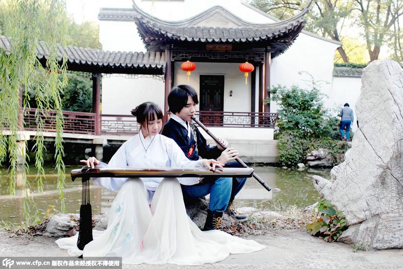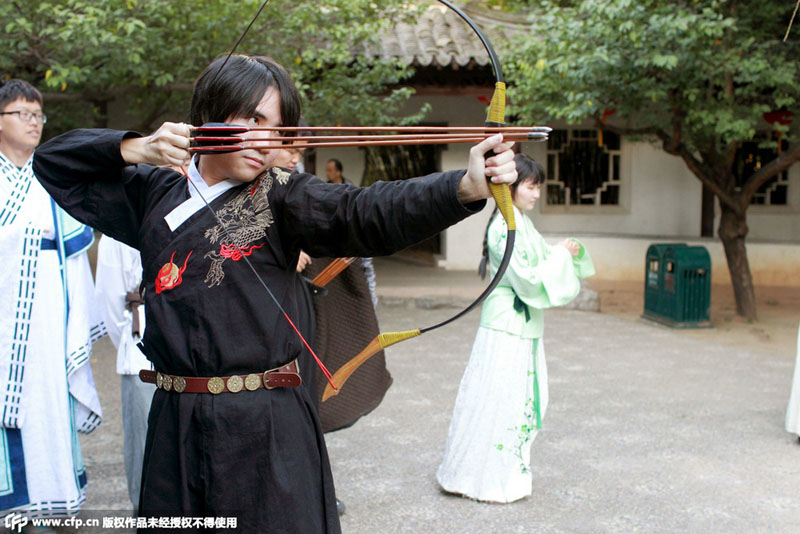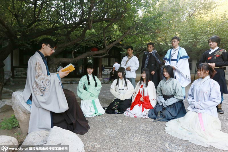 北京紫竹院公園で10月11日、首都経済貿易大學、國際関係學院、北京語言大學、華北電力大學などの漢服社(漢服PRのボランティア集合體)に所屬する學生が漢服マナーの學習交流を行ない、中國伝統(tǒng)文化を受け継いだ。人民網が伝えた。(編集JK)