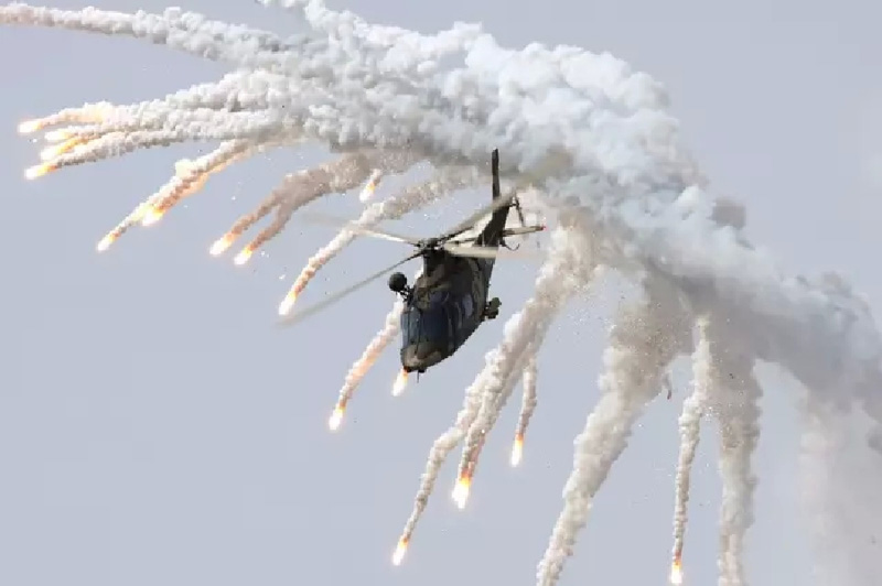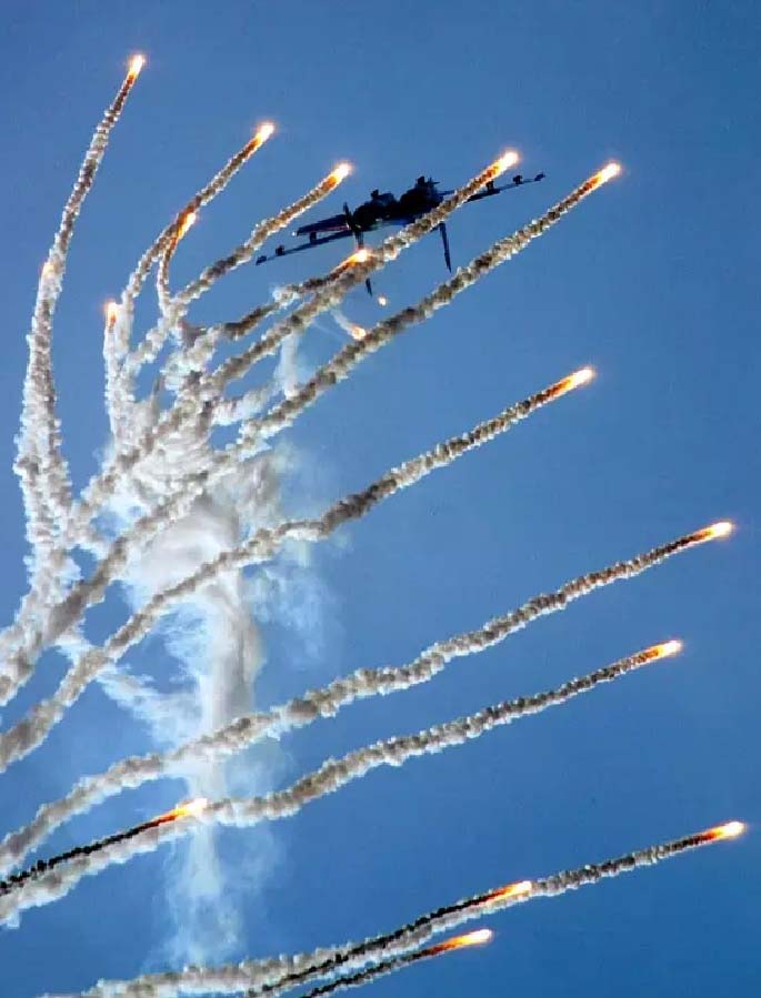 赤外線誘導ミサイルはこれまで軍用機最大の脅威で、ひとたびロックオンされると、加速して逃げるのは賢明とはいえないだろう。では赤外線誘導ミサイルに狙われるた場合、どうすれば良いのか?フレア弾を放つことだ。これで寫真のようにミサイル攻撃から逃げることができる。