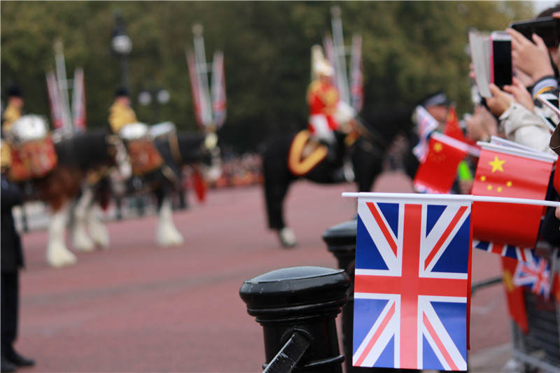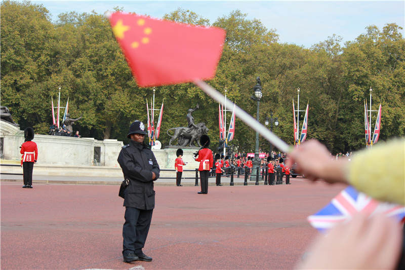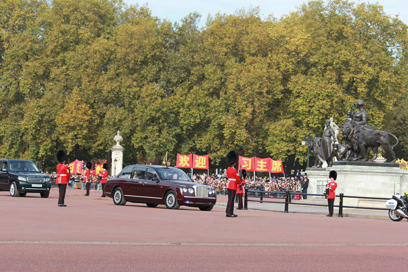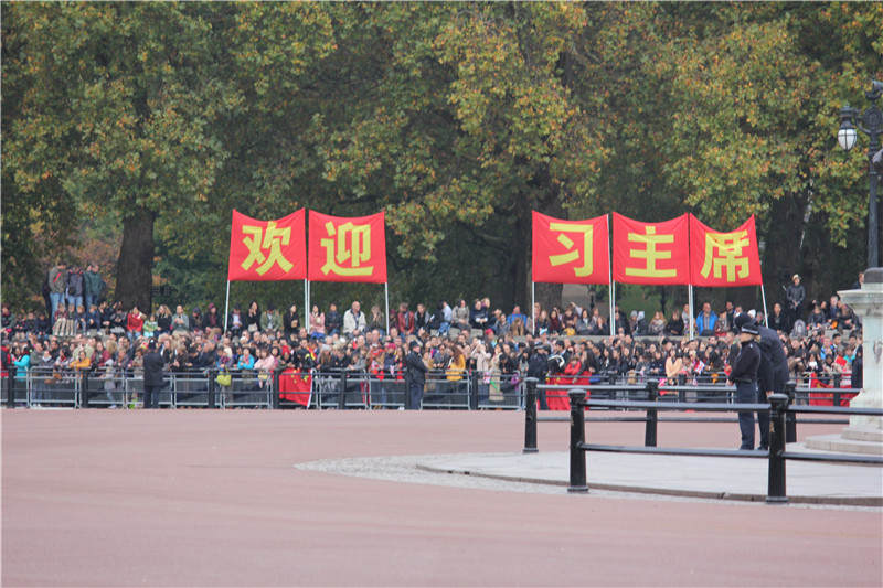 バッキンガム宮殿前では1萬人以上の中英両國の民衆(zhòng)が國旗や橫斷幕を掲げ、習(xí)主席の到著を歓迎した。 (編集JK)