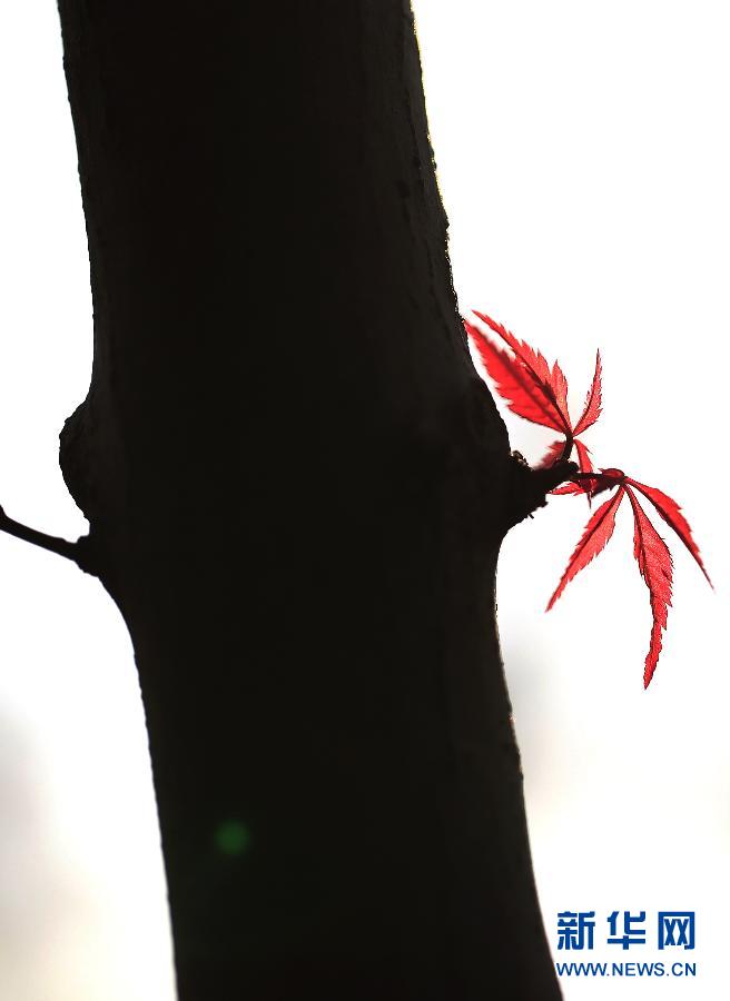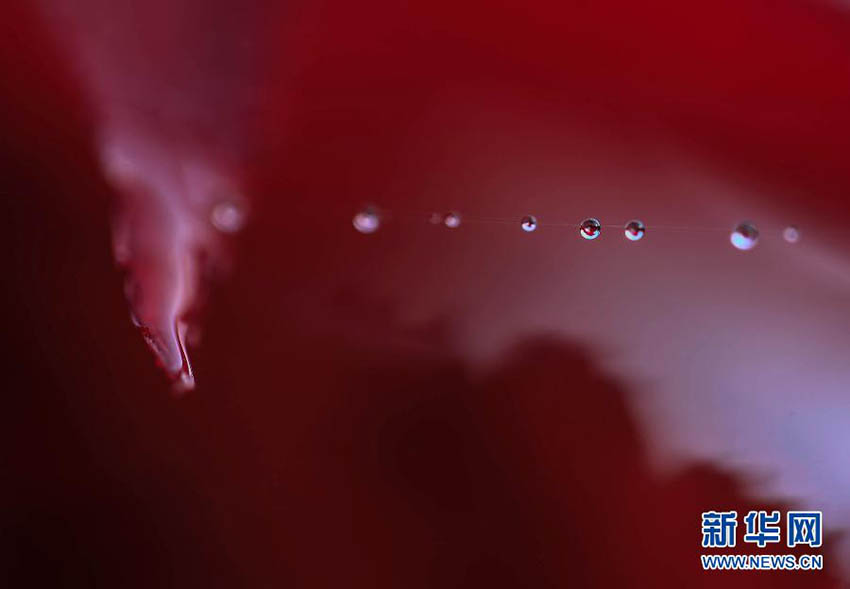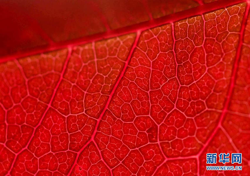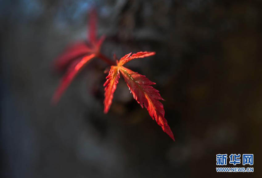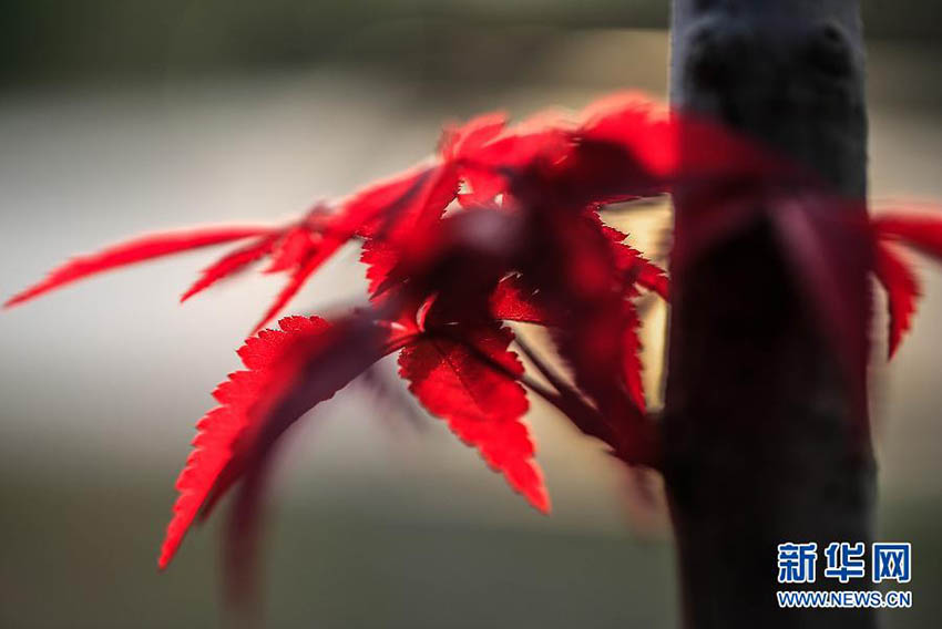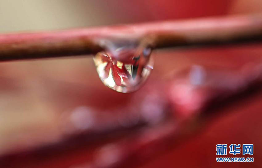 10月22日、江蘇省淮安市の楓林は秋の色に染まり、水滴がついた葉は夕焼けが染めているようだ。(編集JK)