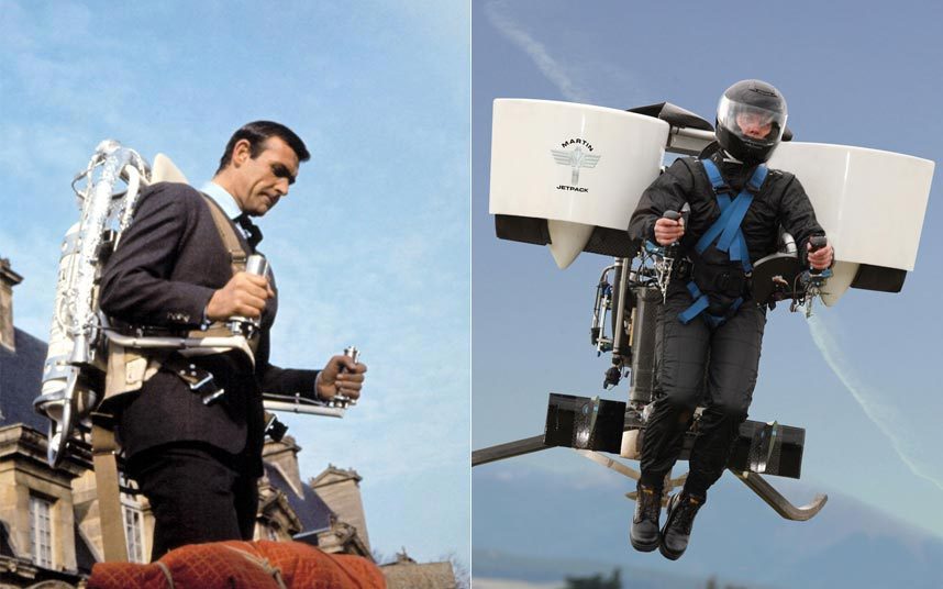 1965年の「007 サンダーボール作戦」で、ジェームズ?ボンドはQのジェットパックを使い、2人の殺し屋から身を隠した。ニュージーランドのMartin Aircraft社は2008年に、ジェットパック「Martin Jetpack」を開発した。この裝置はガソリンエンジンを搭載し、最高時速は60マイルに達する。ガソリン給油後、30分間連続して飛行できる。