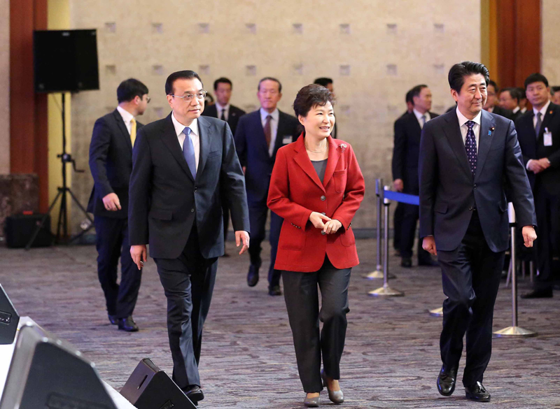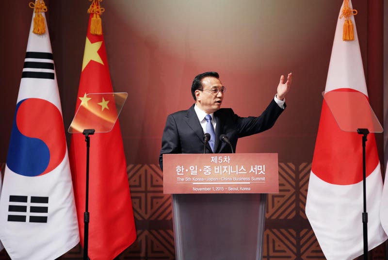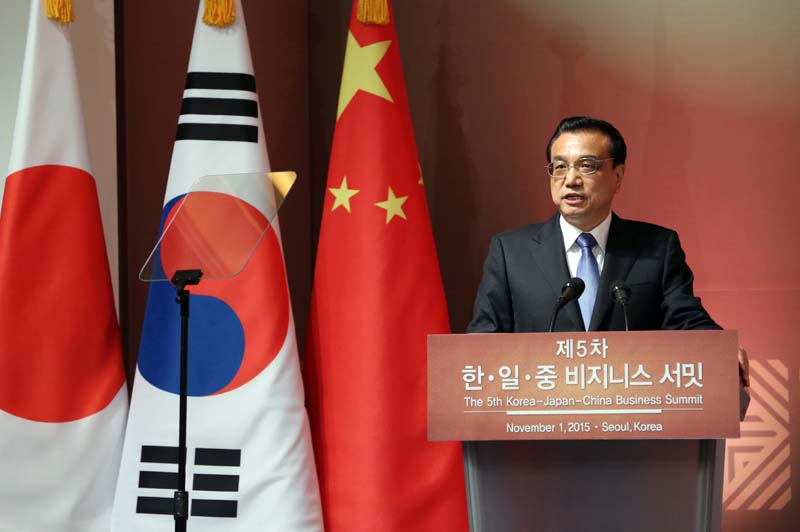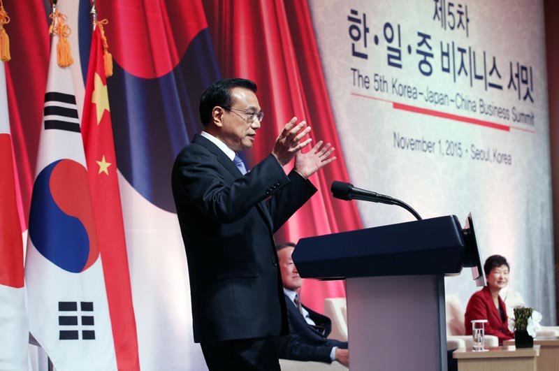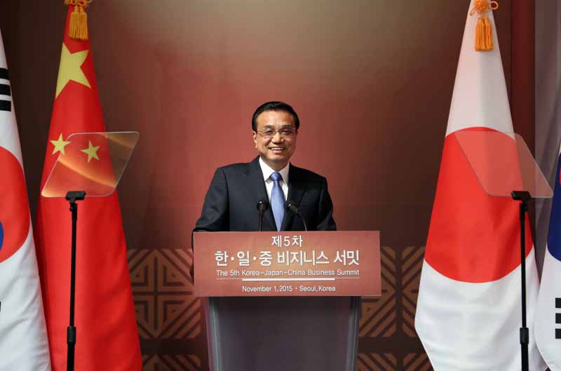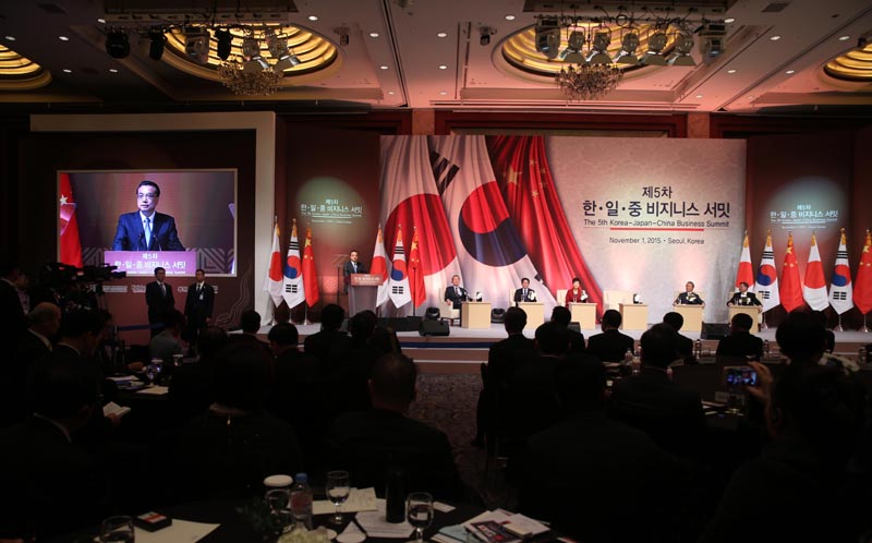 李克強総理は1日午後、ソウルで韓國の樸槿恵大統(tǒng)領(lǐng)、日本の安倍晉三首相と共に第5回中日韓ビジネスサミットに出席した。人民日報が伝えた。