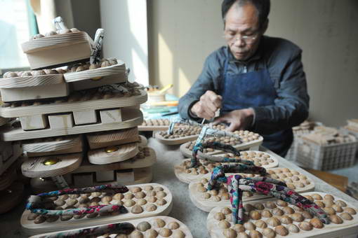 浙江省臨安市天核美工蕓品公司の作業(yè)員が11月3日に、日本で販売される木製按摩下駄を作っていた。同社によると、この下駄は、切斷、研磨、艶出しといった加工が施されたクルミが表面に粘著されており、足の裏をマッサージする効果をもち、最近日本での売上を伸ばしているという。今日早報が伝えた。(編集IM)