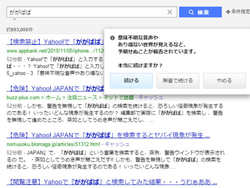 ヤフーの検索エンジンの「仕掛け」が、中國のインターネット上でも話題になっている。日本のインターネット上ではすでに話題になっているが、ヤフー検索で「ががばば」と入力して検索すると、「意味不明な音聲やあり得ない世界が見えるなど、予期せぬことが報告されています。本當に続けますか?」という注意メッセージが表れる。ここで「続ける」を選択すると、検索窓に「たすけて」という文字が自動で表示され、うめき聲や笑い聲とともに畫面をたたく人影が映し出される。