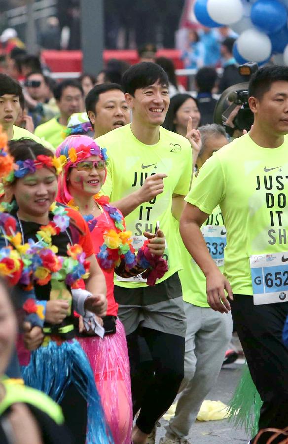 上海國際マラソン2015が11月8日に開催され、中國の元陸上競技選手の劉翔(中)が出発した。同日、上海市の外灘で號(hào)砲の合図とともにスタートし、85の國と地域から合計(jì)3萬5千人の選手が參加した。新華社が伝えた。(編集JK)