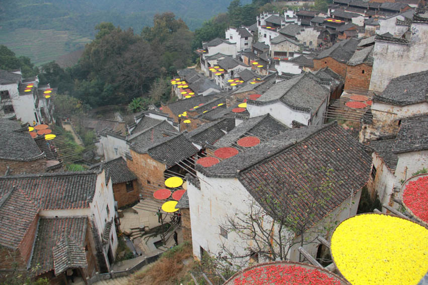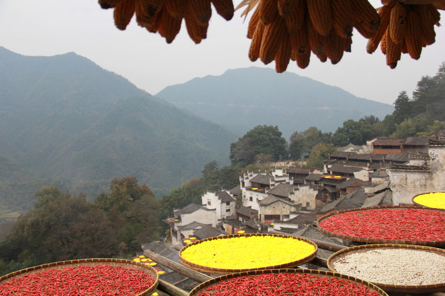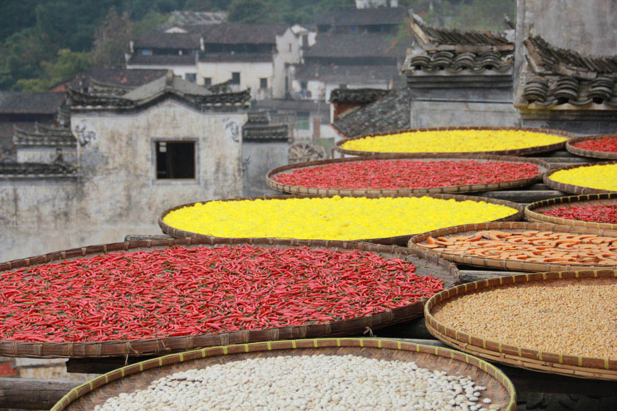 唐辛子や菊、かぼちゃ、とうもろこしなどを栽培しており、いたるところにそれを干す光景が広がる。