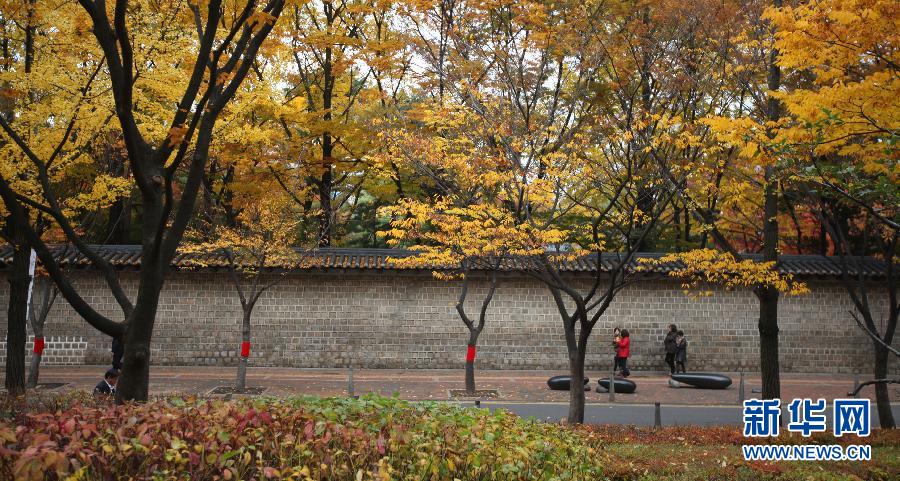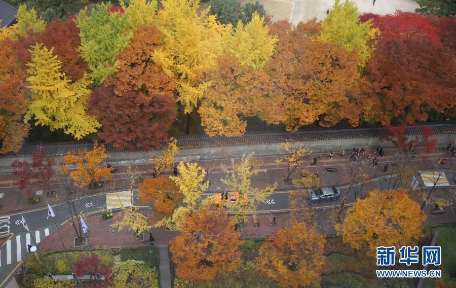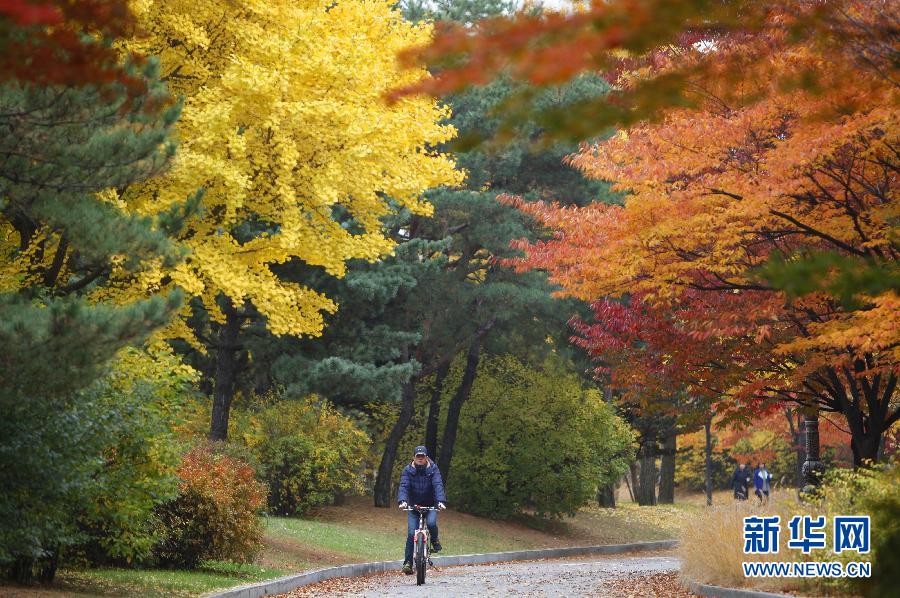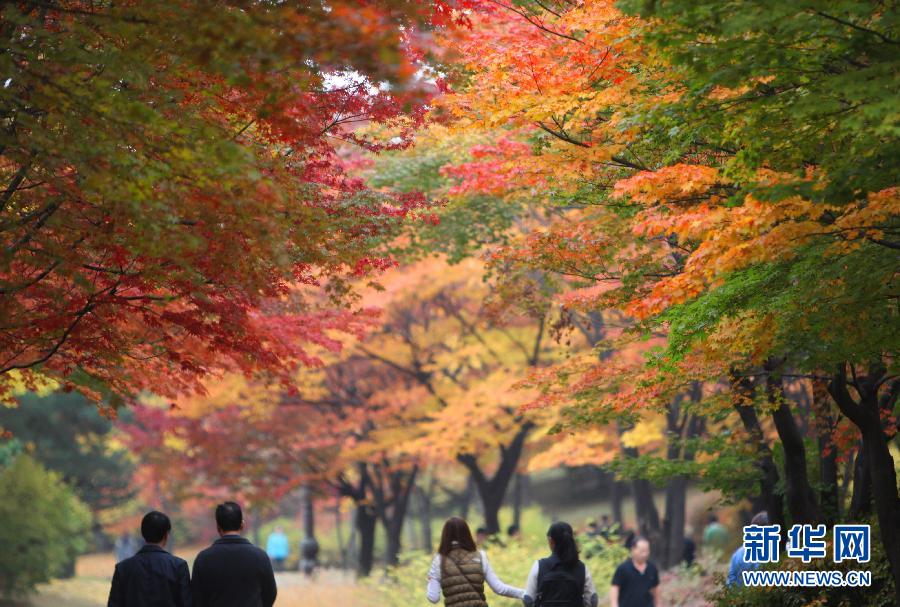 韓國ソウル市の公園で11月10日、市民が散歩している。何度かの秋雨を経て、ソウルの楓の木々は色づき、最も素晴らしい見ごろを迎えた。新華網(wǎng)が伝えた。(編集JK)