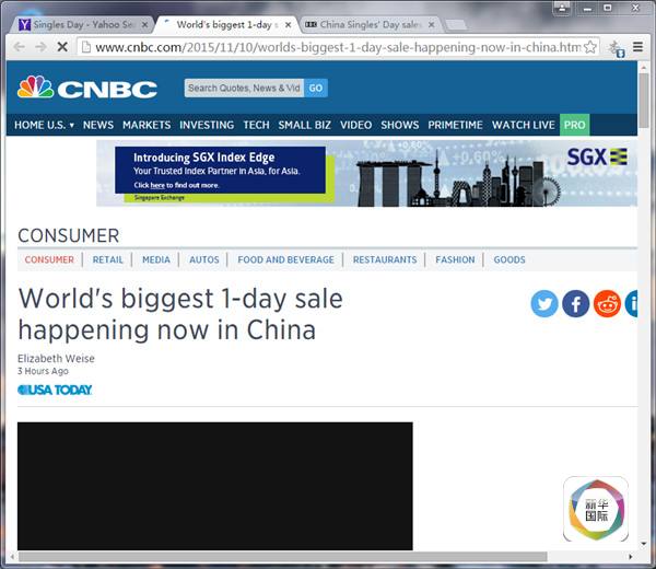 世界最大の金融?経済?ビジネス専門チャンネル米CNBCウェブサイトは、「1日あたり売上世界最高記録、中國で誕生」と題する報道を行い、「中國のダブル11の売上額は、今年は110億ドル(約1兆3500億円)に達する見込み」と伝えた。