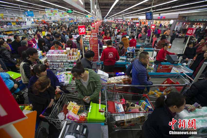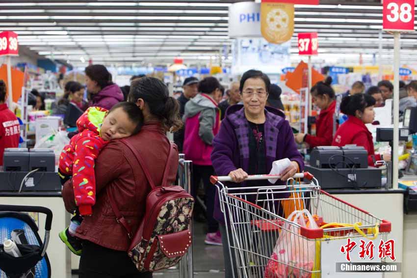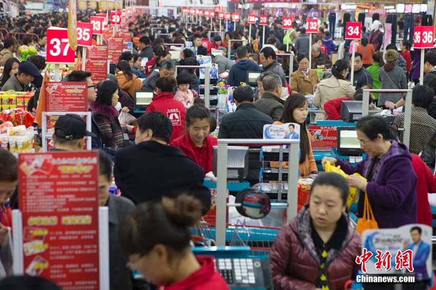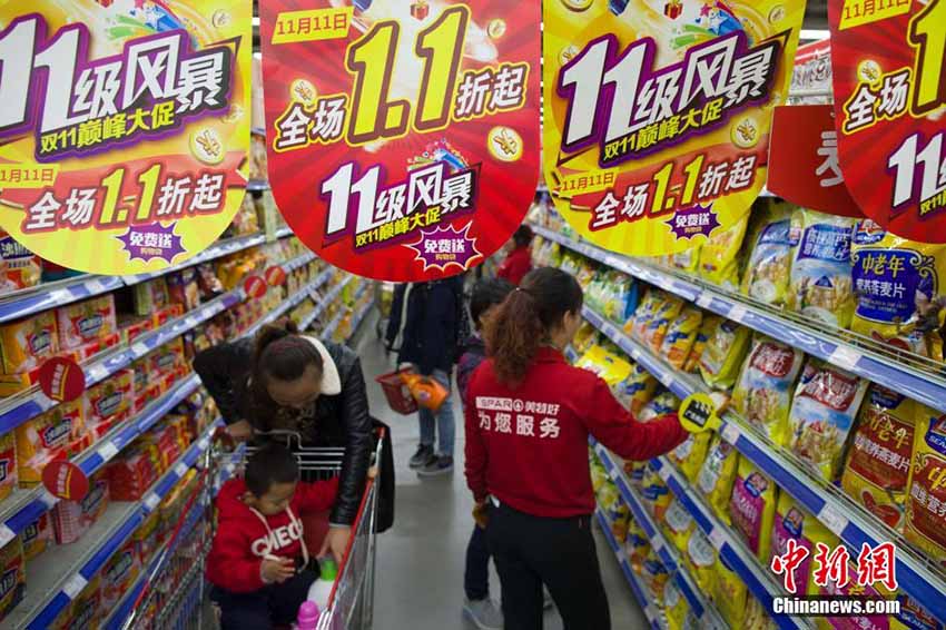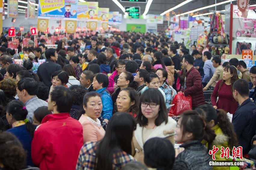 山西省太原市のあるスーパーマーケットが行なった「ダブル11」ショッピングカーニバルのセールで11月11日、大勢の買物客が生活用品の「爆買い」に押し寄せ、まるでお正月の帰省ラッシュのように賑わっていた。(編集JK)