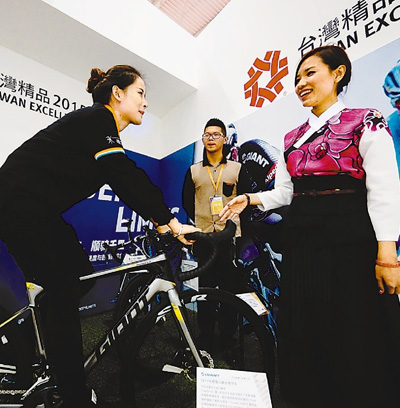 寫真は、北京市民に自転車を紹介する臺灣メーカーの様子。