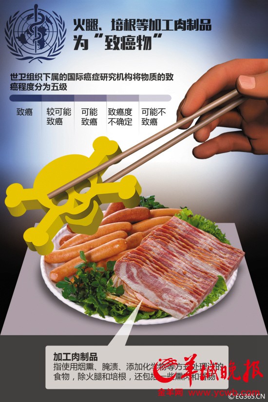 世界保健機(jī)関(WHO)の國(guó)際がん研究機(jī)関(IARC)は10月26日に発表した最新の報(bào)告書(shū)の中で、ベーコン、ハム、ソーセージなどの加工肉が大腸がんのリスクを高める「十分な証拠」があると発表し、発がん性の評(píng)価を5段階のうち、ヒ素などと同じ最も高い分類にした。