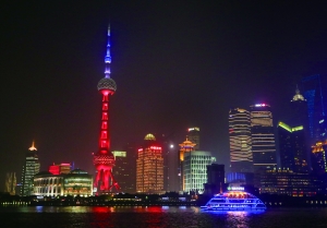 犠牲者追悼の為にライトアップを変更した上海の東方明珠