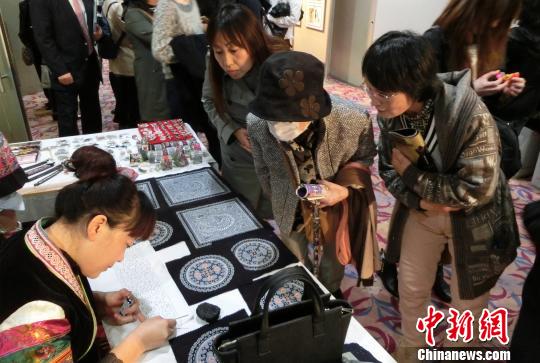 伝統(tǒng)的な民族衣裝のほか、貴州の民族工蕓も同イベントの見どころ。貴州黔東南、畢節(jié)などの無形文化遺産伝承人らが、銀製のヘアアクセサリー?銀飾や苗(ミャオ)族の伝統(tǒng)的な刺繍工蕓?苗繍、ろうけつ染めなどの民族工蕓品を展示している。