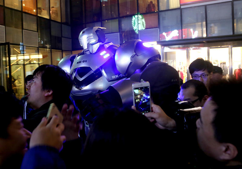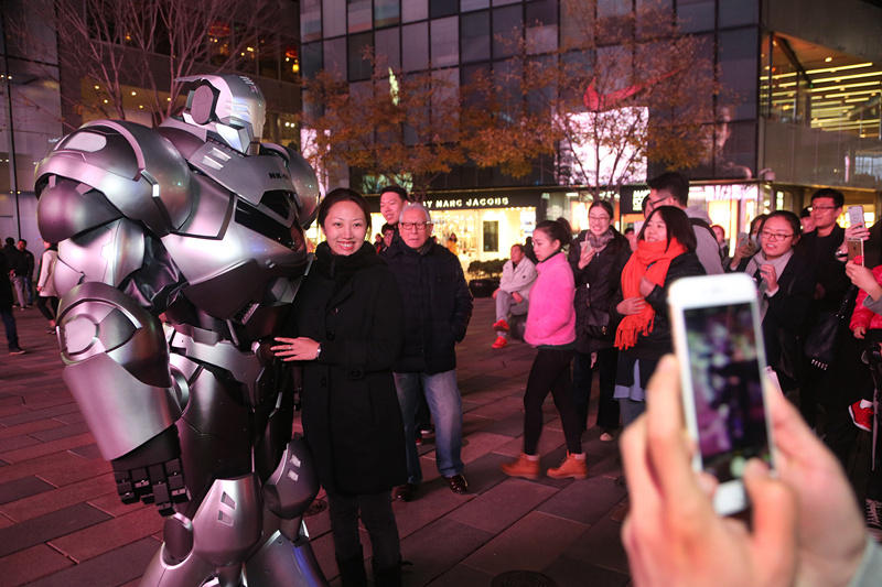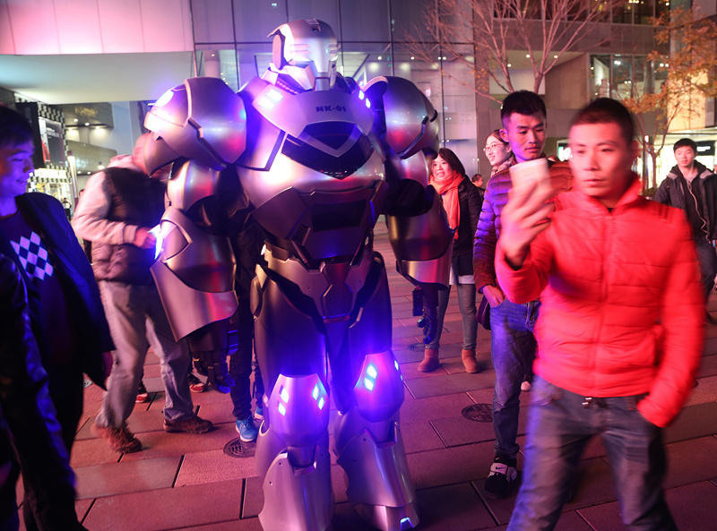北京で11月16日、ロボットもどきのものが彼の「ご主人様」に付き添い、北京の繁華街の三里屯に「散歩」にやってきた。會話や歩行が可能なこのロボットもどきの高さは約2メートルで、ロボットの中に入っている人がコントロールを行っている。(編集JK)