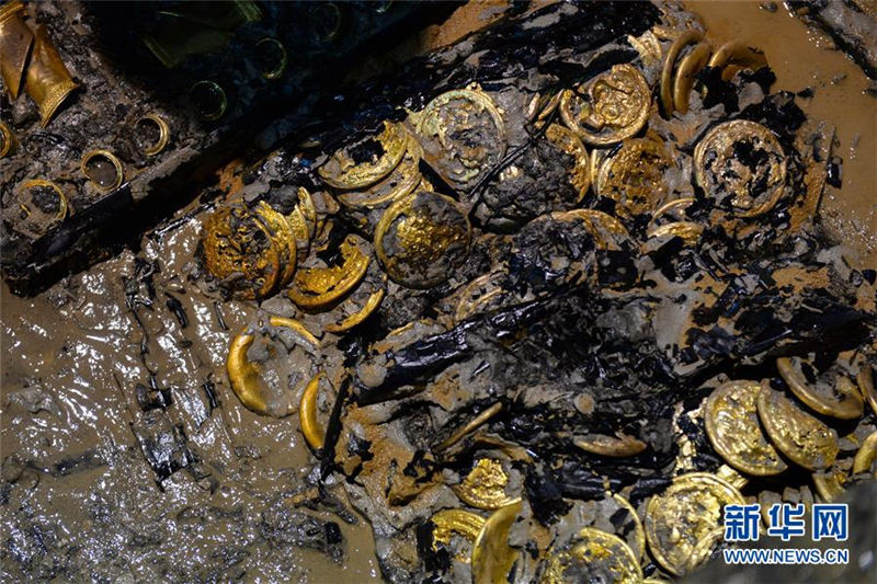 発掘調(diào)査の作業(yè)員は、江西省南昌市にある前漢の海昏侯墓の主槨室(棺をおさめた部屋)の西側(cè)から、1箱分の馬蹄金と2箱分の金餅(金の円形の延べ板)を発見した(計75個)??脊艑W(xué)者は、中國の漢代の墓で、これほど保存狀態(tài)が良好な金製品が、これほど大量に見つかるのは史上初だと述べた。(編集YF)