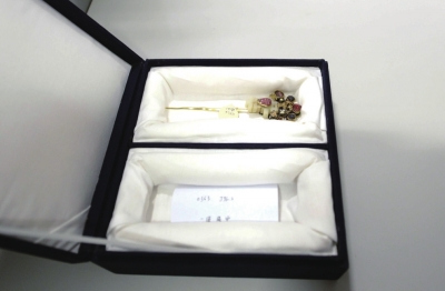 定陵から出土した3000點余りの文化財のうち、約600點は、皇帝や皇族用の絹織物の龍袍?衣裝で、その他は器物となっている。絹織物を保管するために、十三陵の文化財保管部署は、大きさの異なる引き出し付きの棚を特注。深刻に炭化した絹織物を折りたたむことで傷むことがないよう、広げて保存できるようにした。