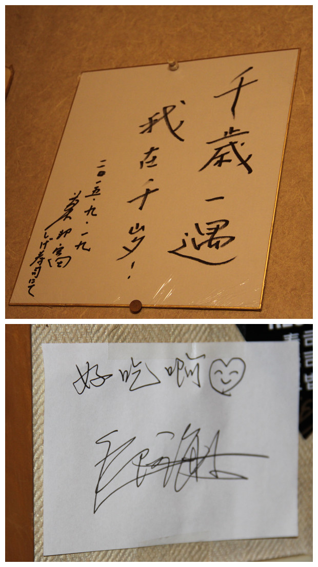 莫邦富氏(上)と毛阿敏さん(下)が書いたメッセージ