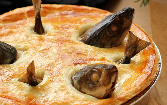 スターゲイジーパイ(星を眺めるパイ)。パイから小魚の頭が飛び出しており、その目は星を眺めている…。