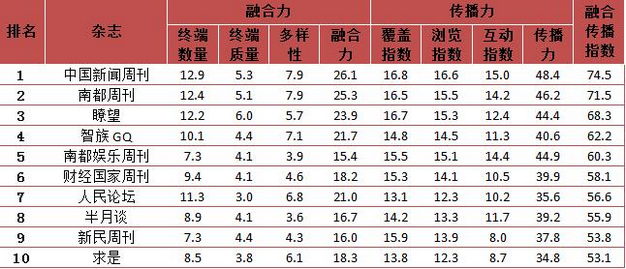 メディアグループ融合力?伝播力ランキングのトップ3は人民日?qǐng)?bào)社、新華通信社、浙江日?qǐng)?bào)報(bào)業(yè)集団。メディアグループ傘下の新聞融合力?伝播力ランキングのトップ3は人民日?qǐng)?bào)、環(huán)球時(shí)報(bào)、新京報(bào)。メディアグループ傘下の雑誌融合力?伝播力ランキングのトップ3は中國(guó)新聞周刊、南都周刊、瞭望。メディアグループ傘下のニュースサイト融合力?伝播力ランキングのトップ3は人民網(wǎng)、新華網(wǎng)、環(huán)球網(wǎng)。