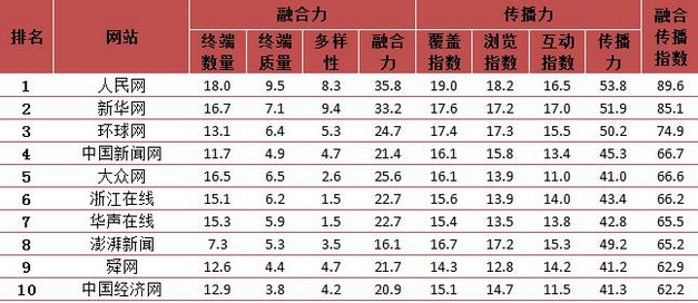 メディア伝播力(60點(diǎn)満點(diǎn))は、カバレッジ指數(shù)(20點(diǎn))、閲覧指數(shù)(20點(diǎn))、インタラクティブ指數(shù)(20點(diǎn))の3つのサブ指標(biāo)からなる。メディア融合力(40點(diǎn)満點(diǎn))は、端末數(shù)(20點(diǎn))、端末の質(zhì)(10點(diǎn))、多様性(10點(diǎn))の3つのサブ指標(biāo)からなる。(編集SN)