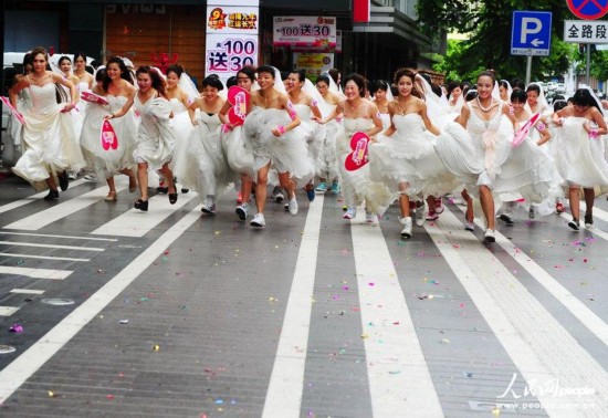 舊暦の七夕前夜の2013年8月12日、広東省広州市ではウェディングドレスを著た100人の新婦が徒競走を行なった。これは現在のところ、最大規(guī)模の「新婦の徒競走」イベントだ。