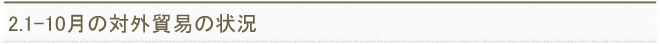 今年1-10月、中國の輸出入額は前年同期比8.5%減の3兆2269億6千萬ドルで、このうち輸出が同2.5%減の1兆8564億5千萬ドル(約227兆円)、輸入が同15.7%減の1兆3705億2千萬ドル(約168兆円)となったと発表、10月當(dāng)月では、輸出入額は12.1%減の3231億9千萬ドル(約40兆円)となり、このうち輸出が6.4%減の1924億1千萬ドル(約24兆円)、輸入が18.8%減の1307億7千萬ドル(約16兆円)となった。