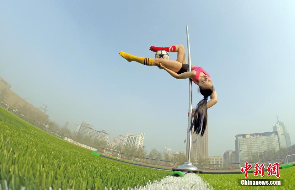 ポールダンス美女が空中サッカー、高難度の技を披露