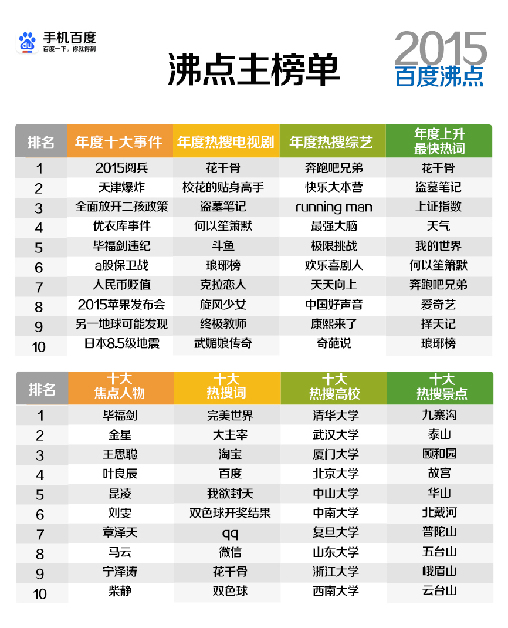 検索エンジン大手の百度は7日、「2015年度百度沸點(diǎn)検索人気ワードランキング」を発表した。このランキングは、6億人に上る百度ユーザーがこの1年、検索という行為を通じて「投票」した最終結(jié)果で、ネットユーザーが今年、どのようなことに最も注目したのかが直接反映されている。新華網(wǎng)が伝えた。