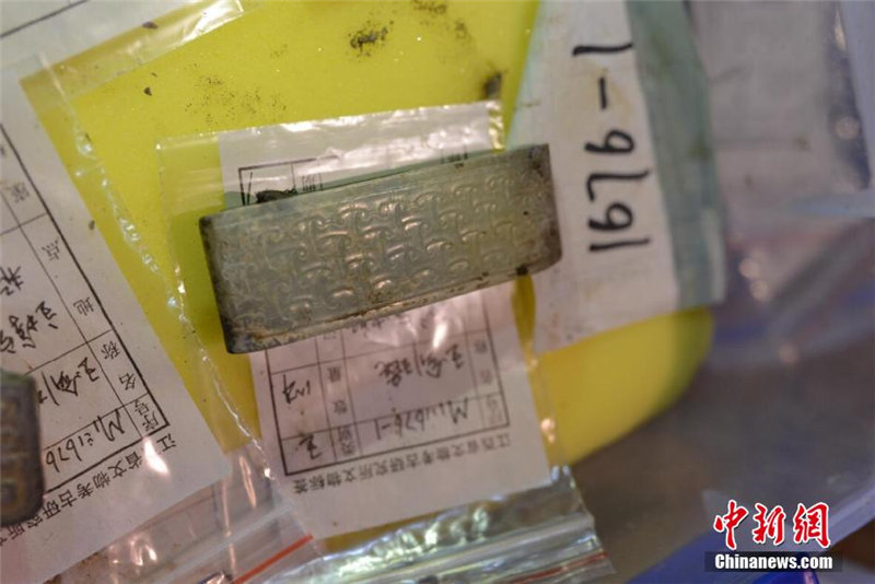 発掘調(diào)査隊の隊長、江西省文物考古研究所の楊軍研究員は、「重ね合わせの関係を見ると、この9つの鼎は先ほど主槨室の西側(cè)から見つかっていた馬蹄金と金餅(金の円形の延べ板)と同じく、寢具の下から見つかった。そのうち7つが四角形の取手、2つが円形の取手を持つ」と語った。