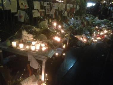 〈襲撃のあった劇場(chǎng)「バタクラン」前に捧げられたキャンドルやメッセージ(19日撮影)〉