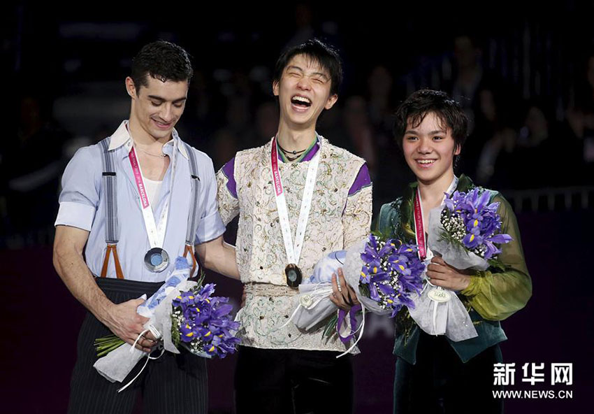 フィギュアスケートGPファイナルの表彰臺(tái)にて12月12日、優(yōu)勝した日本の羽生結(jié)弦選手(中央)、2位はスペインのファビエル?フェルナンデス選手(左)、3位は日本の宇野昌磨選手。同日、スペインのバルセロナで行われた2015フィギュアスケートGPファイナルの決勝で、日本の羽生選手が330.43點(diǎn)をたたき出し優(yōu)勝し、ショートプログラム、フリー、総得點(diǎn)で世界新記録を達(dá)成した。新華社が伝えた。(編集JK)