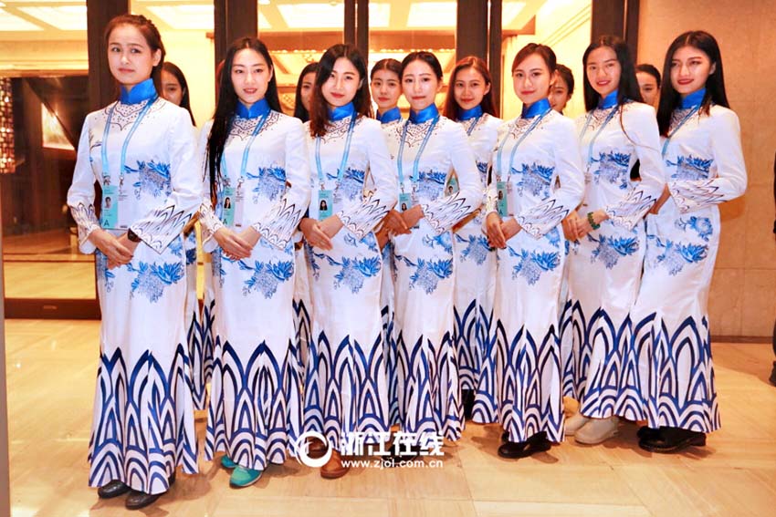 烏鎮(zhèn)枕水ホテルで12月13日、浙江伝媒學(xué)院(浙江?。─未髮W(xué)生コンパニオンが第2回世界インターネット大會(huì)で、白地に青で染め付けした伝統(tǒng)的な陶磁器をモチーフにした染付風(fēng)のチャイナドレスを初披露した。前回の同大會(huì)ボランティアが著用した染付風(fēng)のチャイナドレスが素晴らしく艶やかで、染付風(fēng)のチャイナドレス姿の大學(xué)生コンパニオンの寫真がネットで人気となり相次いで転送されていた。浙江在線が伝えた。(編集JK)