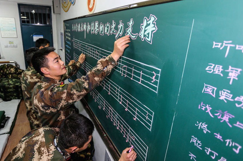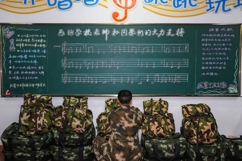 撤退前夜、武裝警察寧波分遣隊(duì)の隊(duì)員は、中國(guó)の偉大な小説家?茅盾氏の母校である烏鎮(zhèn)植材小學(xué)校の校舎を臨時(shí)兵舎として借りたことについて、教員や生徒たちに感謝の気持ちを示そうと、黒板に心からのメッセージを書(shū)き遺した。また、野戦文蕓小文チームによる「強(qiáng)軍の軍歌」の楽譜と歌詞も黒板に描いた。