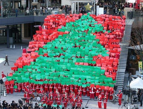 日本の大阪でこのほどサンタクロースの衣裝を著た一般人1000人がそれぞれ手に持ったカラープレートを繋ぎ合わせて巨大な「クリスマスツリー」を作り、壯大な景観となっている。日本のメディアが伝えた。