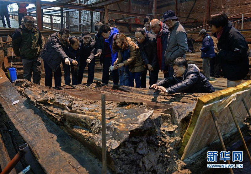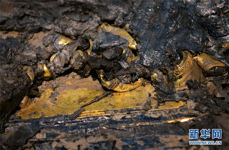 発掘作業(yè)員は12月22日、江西省南昌市にある前漢??;韬钅工沃鞴驻蝺?nèi)棺?外棺の間から、多くの金の板を発見した。秦?漢王朝の考古學(xué)に詳しい権威ある専門家は、漢王朝の墓から金の板が見つかるのは初めてのことであり、墓の主の重要な情報をもたらす可能性があるとした。新華網(wǎng)が伝えた。