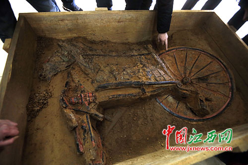 記者は専門家チームに従い、同センターでこれまでに出土している馬車、馬の像、數(shù)十振りの剣を目にした。信氏は、「馬車の整理は上手くいっており、主な色彩が呈されている。數(shù)十振りの剣は非常に特徴的で、玉製の剣のほかに、戦國(guó)時(shí)代の青銅剣がある。これは墓の主が生前コレクションを好んだことを示しており、これまでも先秦時(shí)代の文化財(cái)が何度か見(jiàn)つかっている」と話した。(編集YF)