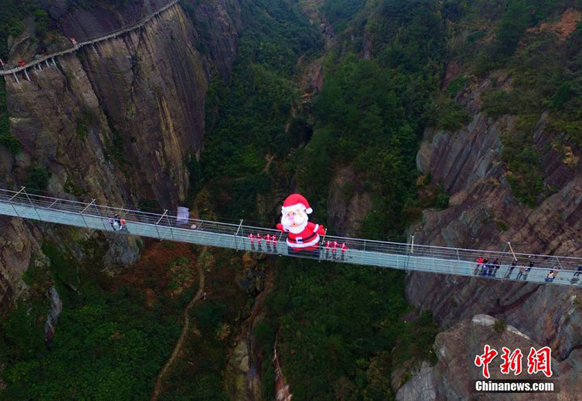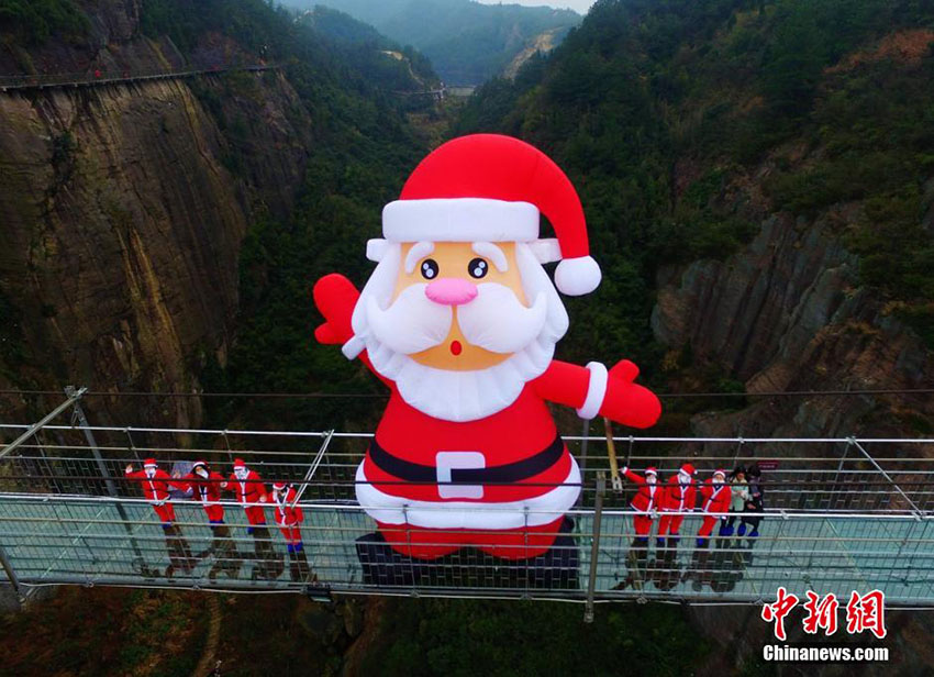クリスマス前夜の12月23日、湖南省平江県石牛寨國家地質(zhì)公園の全透明ガラス橋に高さ10メートルの「巨大サンタクロース」が登場、とぼけた表情の可愛い姿に大勢の観光客が集まり、記念寫真を撮っていた。(編集JK)