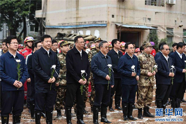 事故現(xiàn)場(chǎng)では全員が地滑り事故の犠牲者に黙禱を捧げた