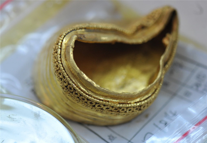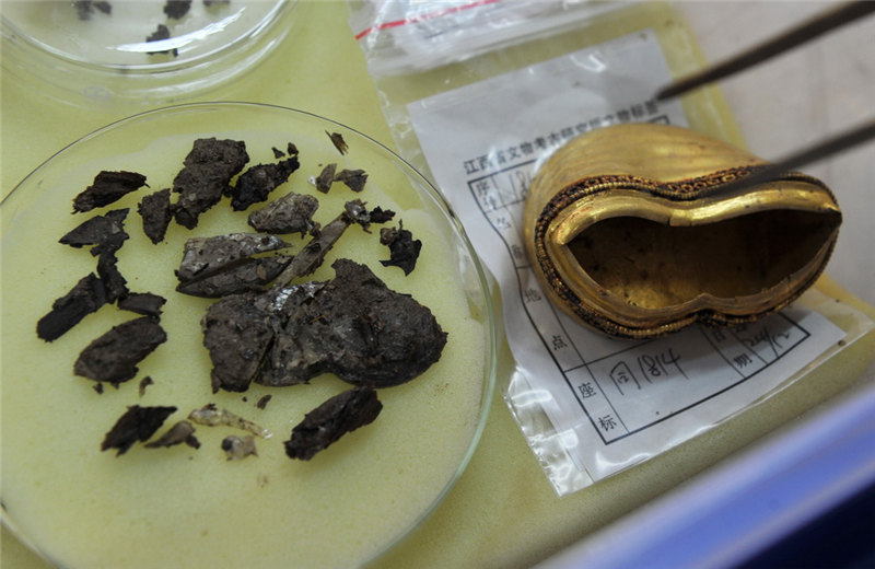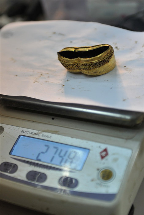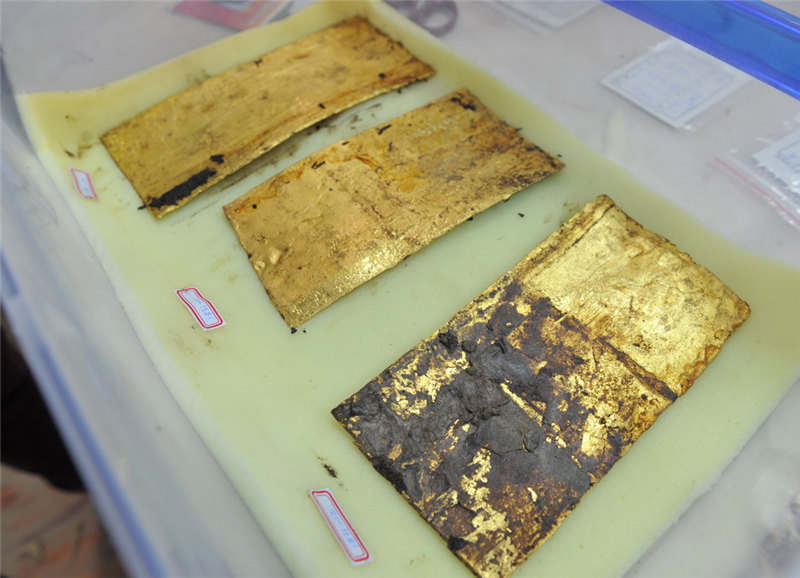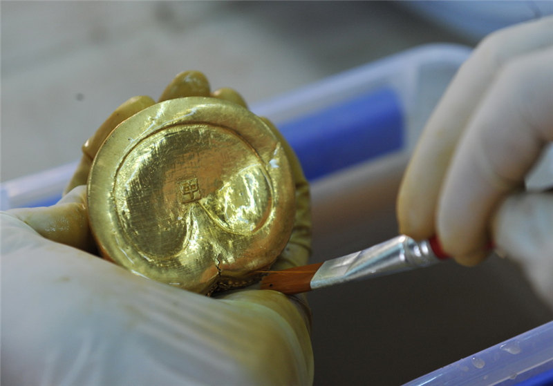 江西省南昌市にある前漢?海昏侯墓の臨時文化財保護室で27日、作業(yè)員が25日に主棺南側(cè)で見つかった金の板、馬蹄金などの整理を行った。馬蹄金は大小の2種類に分かれる。大きい方の馬蹄金には「上」「中」「下」の3つの文字が刻まれているが、専門家はこれに関する結論を下していない。主棺の外棺?內(nèi)棺の間にある金は、25日午後にすべて取り出された。そのうち金餅(金の円形の延べ板)は96枚、馬蹄金は33枚、麟趾金(當時の貨幣の一種)は15枚で、他にも20枚の金の板が見つかった。今回見つかった金の板の長さは約23センチ、幅は10センチ、厚さは0.3センチ。これに主槨室(棺をおさめた部屋)から見つかった金を加えると、海昏侯墓からは370件以上の、重さにして78キロの金が見つかっている。人民網(wǎng)が伝えた。(編集YF)