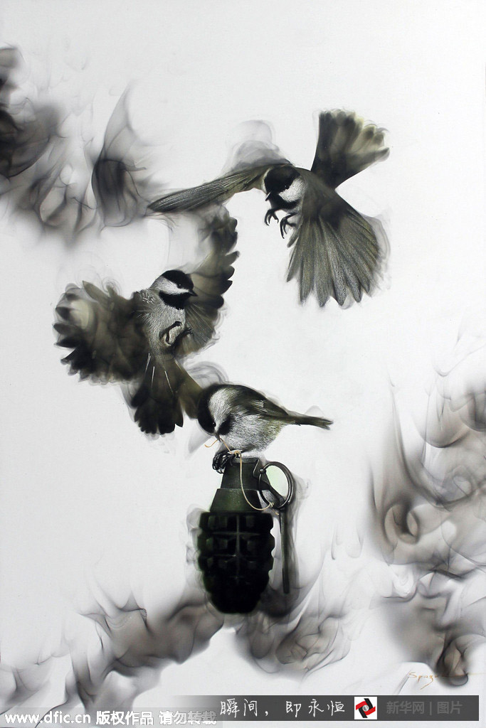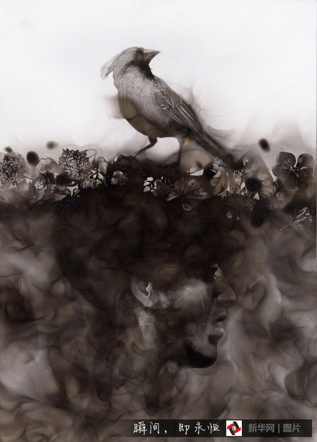カナダの蕓術(shù)家、スティーブン?スパザック氏は燻した蝋燭の煙を使って、美しい蕓術(shù)作品を作り出している。絵畫製作の全ての過程は煙を使って即興で製作し、蝋燭やトーチの煙を自在に紙の上に移したあと、鉛筆やブラシ、羽を用いて光沢を出し、灰色の斑點(diǎn)に立體感をもたせ、輪郭をはっきりさせる。新華網(wǎng)が伝えた。