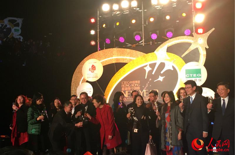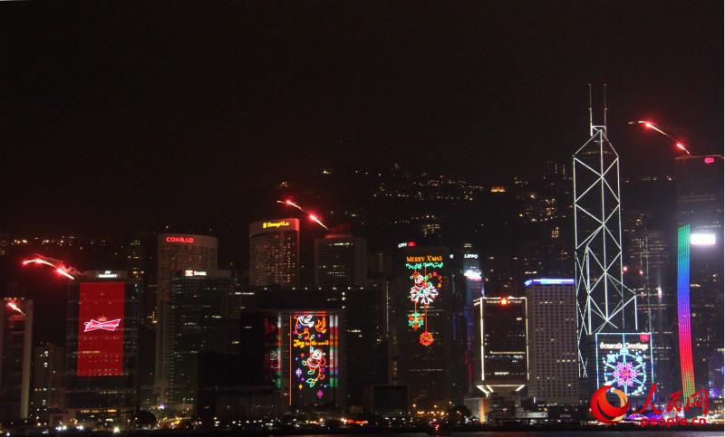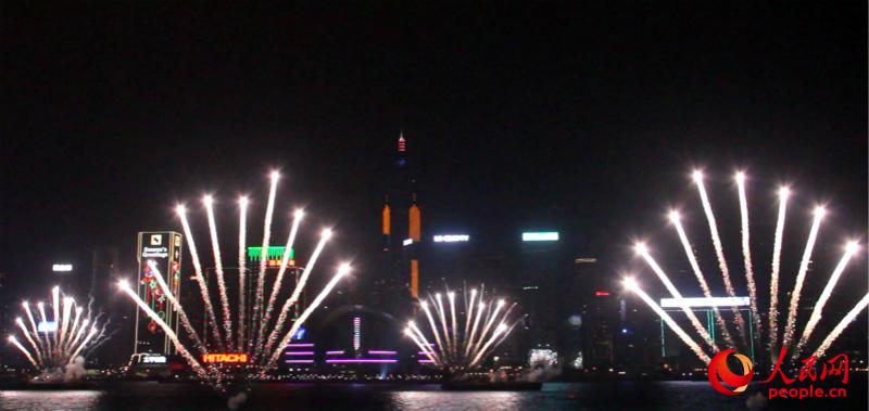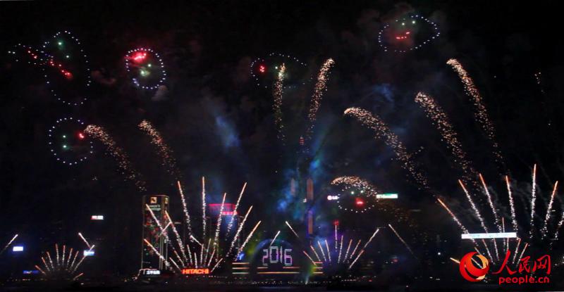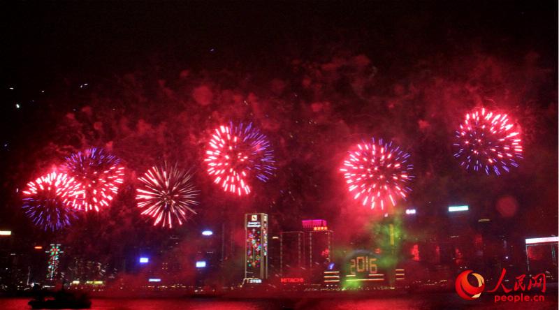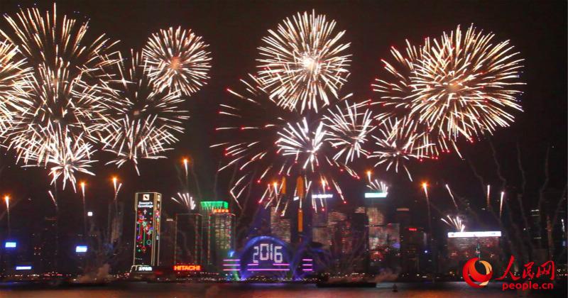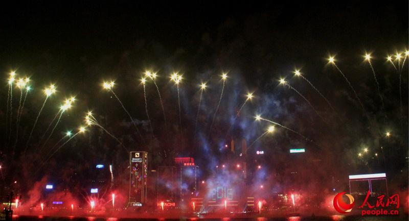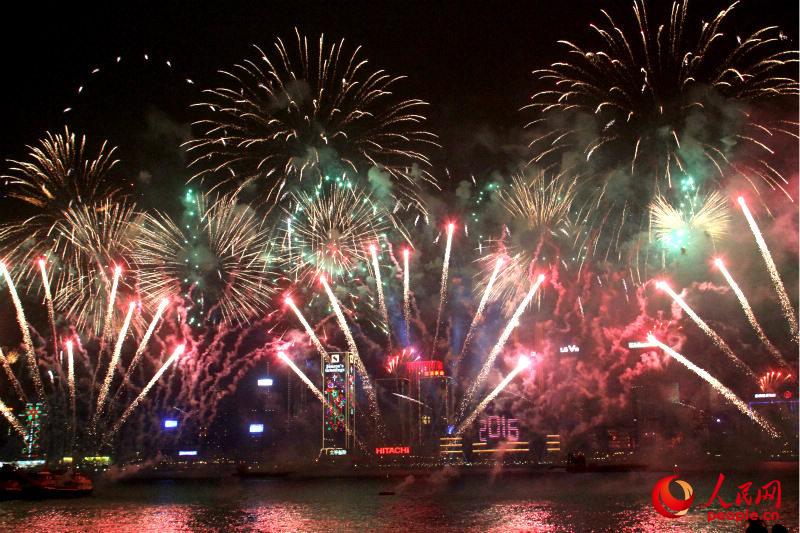 2015年最後の夜、香港のビクトリアピーク両岸で盛大な新年のカウントダウンイベントが行われ、香港の夜空に花火上がった。香港各區(qū)から數(shù)十萬人が集い、新年の到來を祝った。(編集IM)