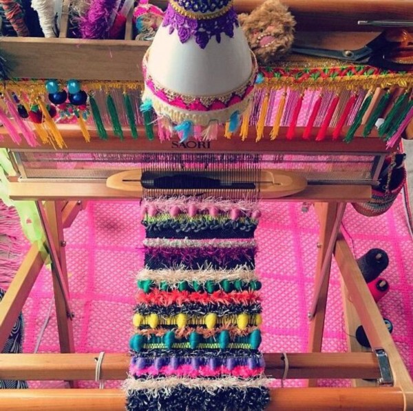 森千波さんは大阪に住み、積極的に作品を発表している織物アーティストで、彼女の工房には色鮮やかな毛糸や布で編み上げられた個性的なストールや帽子、バッグ、上著などがあふれており、これらを販売している。