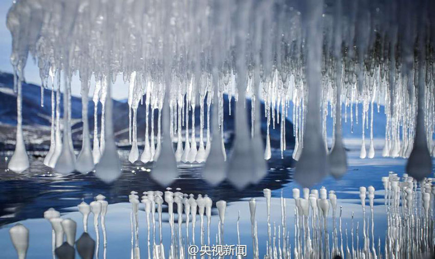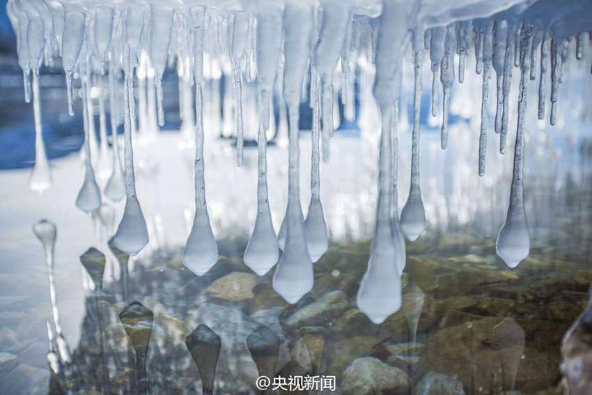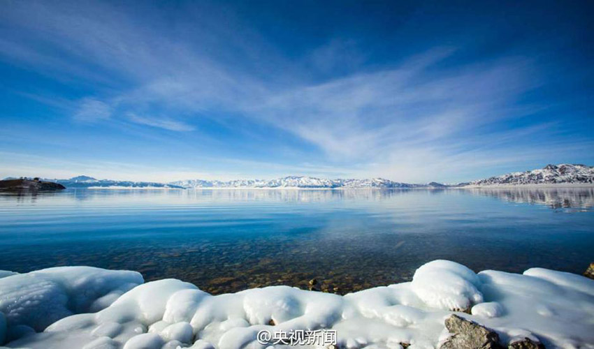 新疆維吾爾(ウィグル)自治區(qū)烏魯木斉(ウルムチ)から520キロ余りの距離にあるサリム湖は天山の麓にはめ込まれた青い寶石のようで、清らかに美しく靜かに佇んでいる。あちらこちらの雪や水の間につららがぶら下がり、伝説の世界を彷彿とさせ、湖に映る影は仙境のようだ。(寫真出典:中央テレビニュースセンター公式微博〈ウェイボー〉)(編集JK)