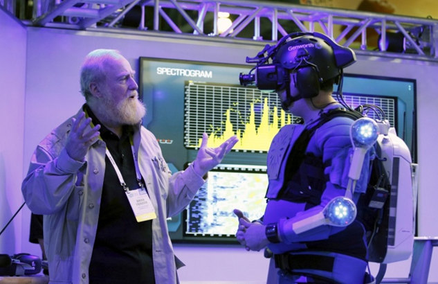 (1)Applied Minds社は、高齢者の感覚を體験できるハイテクスーツ「R70i Age Suit」を開発した。寫真は「R70i Age Suit」を著用した記者と話をするApplied Minds社の創(chuàng)業(yè)者Bran Ferren氏。