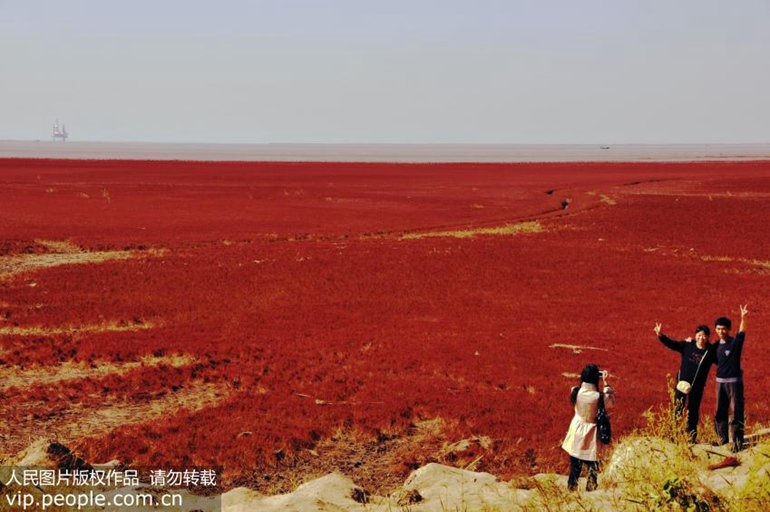 【遼寧、紅海灘】毎年錦秋の10月、遼寧省盤(pán)錦市大窪濕地紅海灘は秋の美しい景色を魅せ、大勢(shì)の市民や寫(xiě)真愛(ài)好家が訪れ、鑑賞している。
