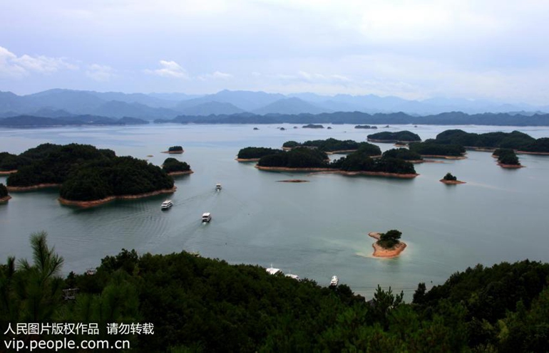 【浙江、千島湖】千島湖景勝地には群島が點(diǎn)在し、港が縦橫に入り組んでおり、生態(tài)環(huán)境が美しいことで有名だ。高いところから眺めると、千鳥(niǎo)湖には大小さまざまな島が300島余り點(diǎn)在し、息をのむばかりだ。(編集JK)