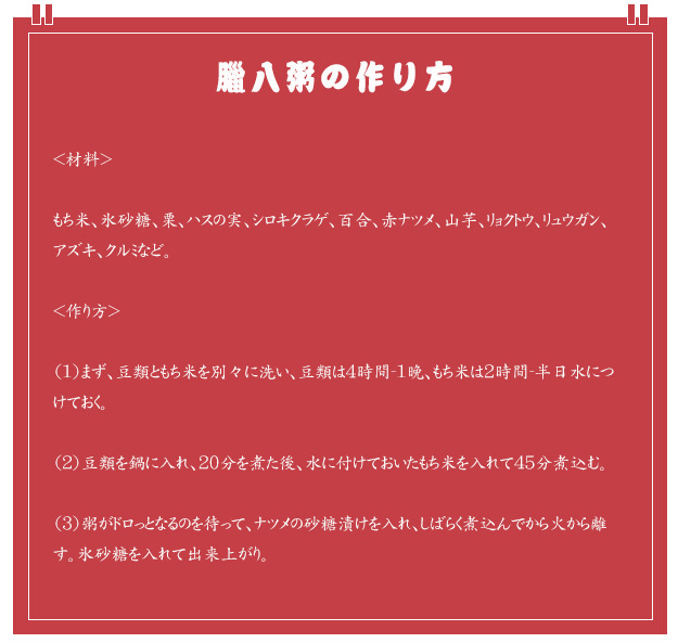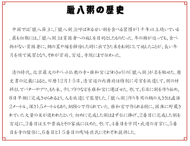 舊暦12月8日(今年は1月17日)は、中國で「臘八節(jié)(ろうはちせつ)」と呼ばれる仏教と儒教のお祝いの日。この日は五穀豊穣を祝い、まもなく春節(jié)を迎える準(zhǔn)備をする日である。
