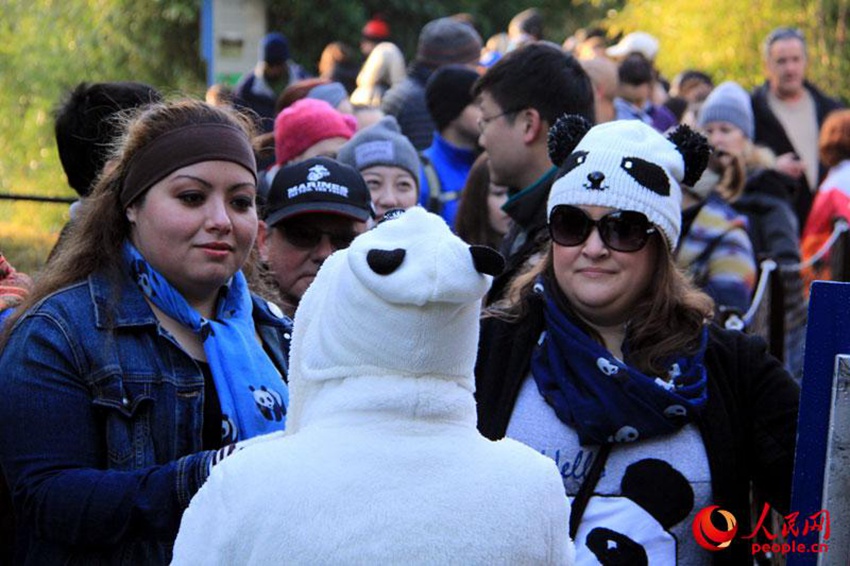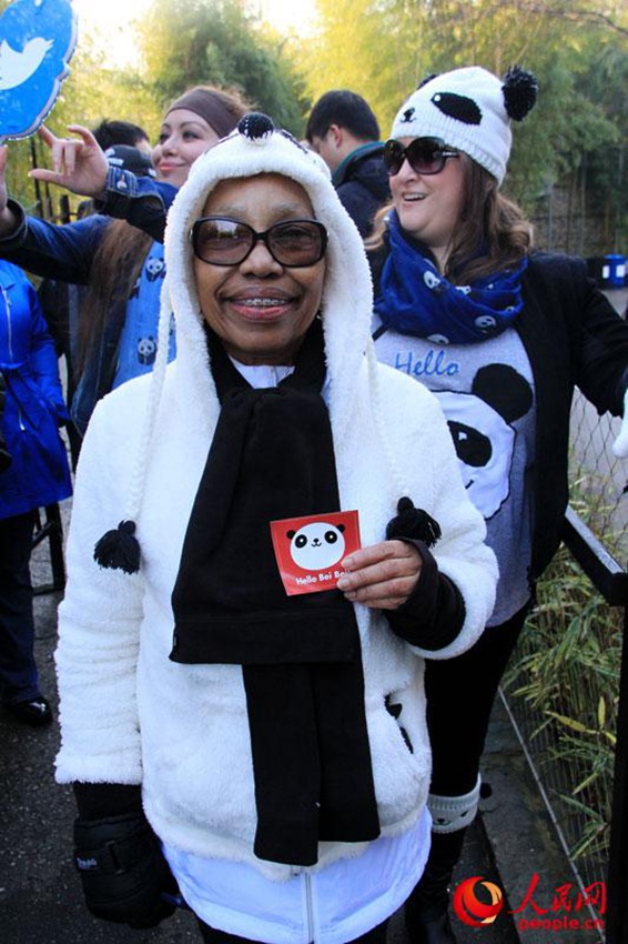 同日朝、公開開始時間の前に、動物園內(nèi)パンダ舎のゲート前には長い列ができた。その中には、西海岸からはるばる駆けつけたパンダ愛好家もいた。大勢の來園者に対処するため、動物園側(cè)は、來園者を50人1組に分け、パンダ舎での見學時間を1組あたり約15分に制限した。