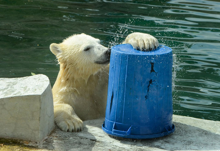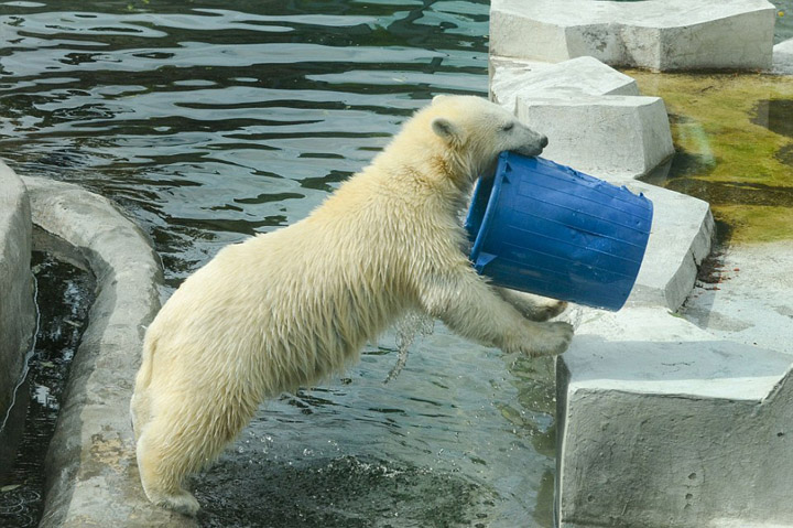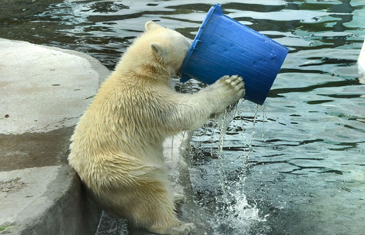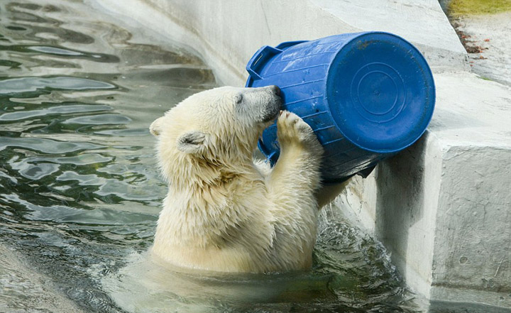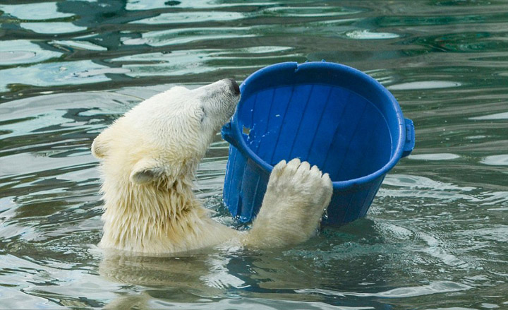 初め、このホッキョクグマは水中に立ち水を汲み、バケツ一杯になるのを待って素早く持ち上げ、一気に飲み干した。その後、またバケツを持って水中で遊び始めた。このシーンはオルガ?ドミトリエーバさんというカメラマンが撮影したものだ。